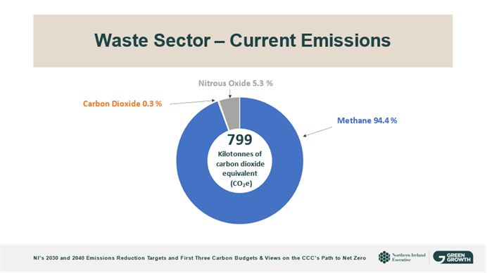 3.58 In terms of what the remaining emissions consist of, we can see that the vast majority from the slide below that Methane (CH4) has the lion's share of the total amount of GHG’s attributed to the waste sector at just over 94%, the majority of which originates from the landfilling of waste, especially biodegradable waste. This makes tackling these types of GHG’s a priority for the first carbon budget.