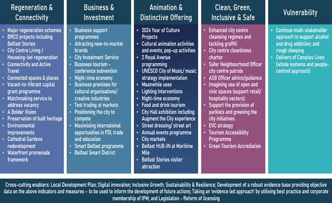 3.6 The refresh of the Belfast Agenda was launched in April 2021 and continued most recently with the public consultation which closed on 2 October 2023. The city centre and its role in supporting the growth ambitions set out in the Belfast Agenda, as well as its importance as a place to visit, live, work and invest in was highlighted by a large no of respondents. On the basis of this feedback from stakeholders and the public as a whole, the Future City Centre has emerged as a priority area within the ‘Our Place’ theme of the Belfast Agenda.