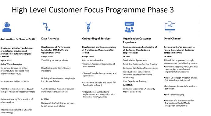 The programme is taking onboard views of Chief Officers as part of the planning of its next phase, in the form of a planning workshop. This will include participants from the Customer Focus Oversight and Delivery boards along with a wider group of stakeholders. The pillars/themes of the new phase have already been agreed by the Oversight board and are displayed below for Elected Members to note.