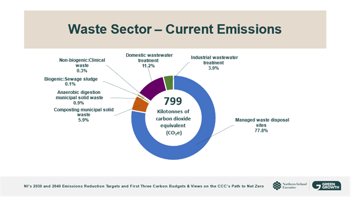 3.57 As demonstrated in the graphic below, it is estimated that the Waste Sector in Northern Ireland is responsible for approximately 4% of current NI emissions and has reduced its emissions by 61% since 1990 base year. However, the Waste sector is still responsible for approximately 799 CO2e kilo tonnes of emissions each year. It is clear that the waste sector still has an important part to play in the reducing emissions overall.