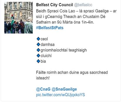 - Conradh na Gaeilge - £30k for delivery of Seachtain na Gaeilge