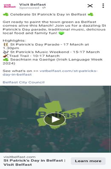 Council operated a digital campaign and online advertising to promote the events taking place under the St Patricks Celebrations banner, including all partner activity and the events at St George’s and 2 Royal Ave. Council directed people to www.belfastcity.gov.uk URL, where the event information was displayed prominently on the page. Additionally, further details could be found on programming at partner websites.